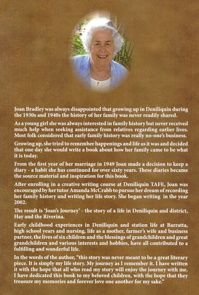 Joan has written a wonderful family history book, published by Deniliquin Newspapers Pty. Ltd., 230 Cressy St. Deniliquin, N. S. W., covering the life and times of both her paternal and maternal forebears and those of her husband, Michael Bradley. It’s a powerful read and I hope you find the opportunity to enjoy it’s merits as I have.