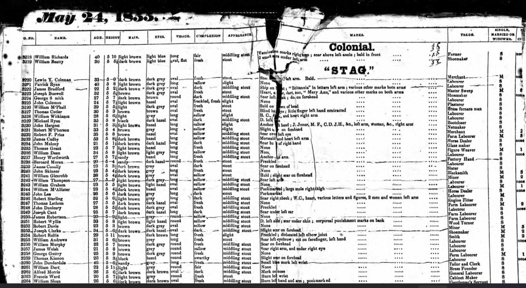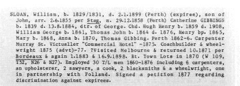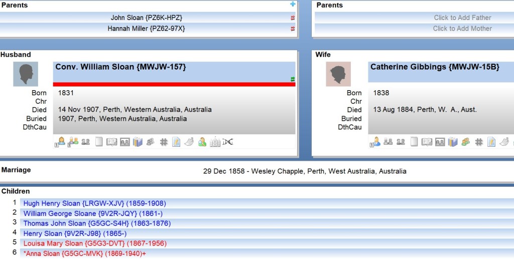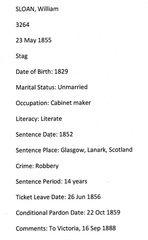 William Sloan Convict # 3264, arrived in Australia on 23 May 1855 per the “Stag”; He married Catherine Gibbon /Gibbings in 1859 at the Wesley Chapple, Perth, Western Australia. Children from the marriage were: Hugh Henry 1859; William George 1861; Thomas John 1863; Henry 1865; Louisa Mary “Christie” 1867; Anna 1869.